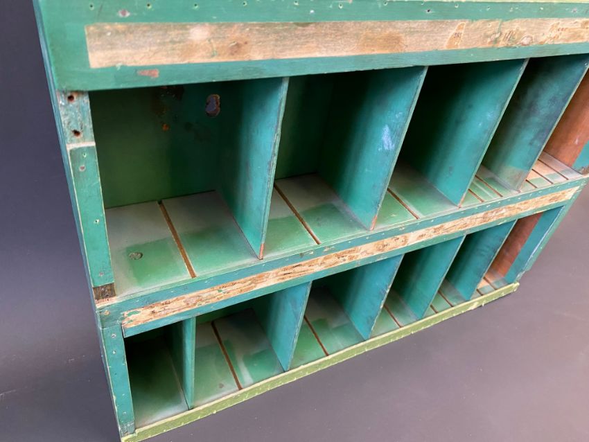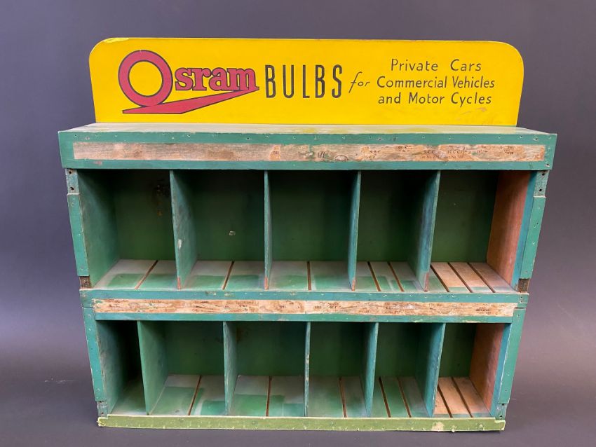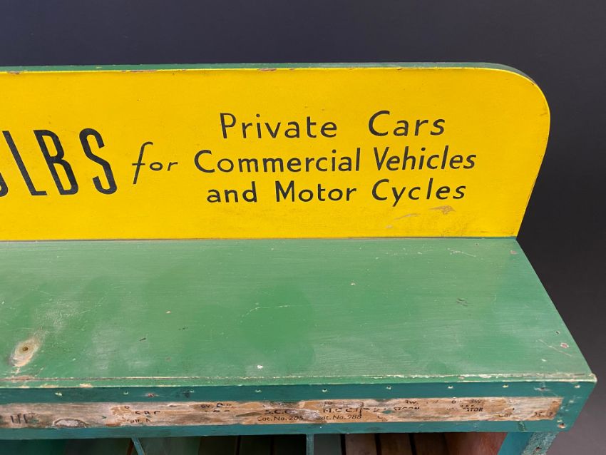An Osram Bulbs wooden dispensing rack for 'Private Cars, Commercial Vehicles and Motor Cycles', 19 1/2" w x 18" h x 4" d.