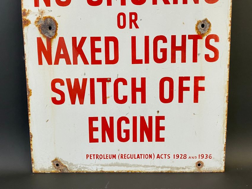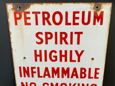 A 'Petroleum Spirit Highly Flammable...' rectangular enamel sign, 15 x 28".