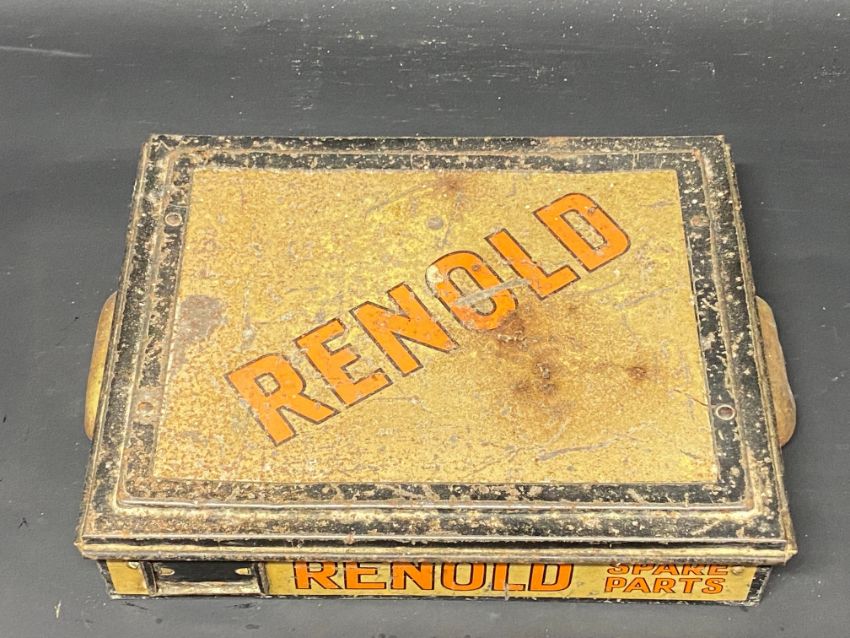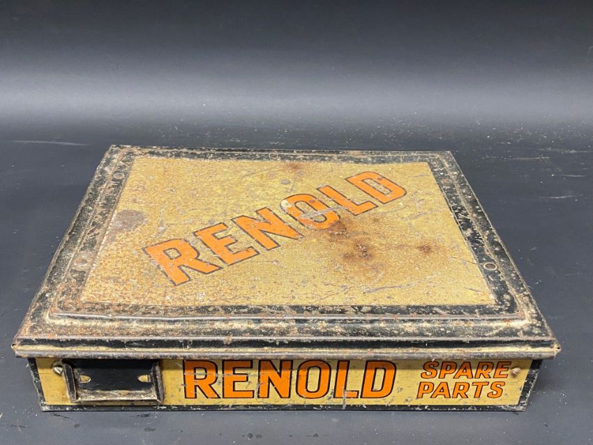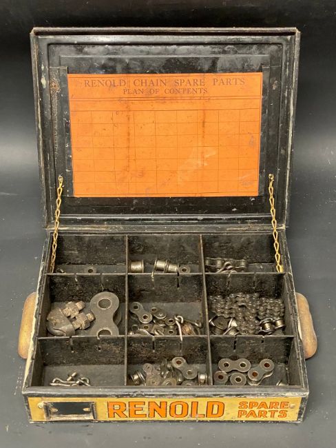 A Renold Chains counter top dispensing tin with some original chain contents.