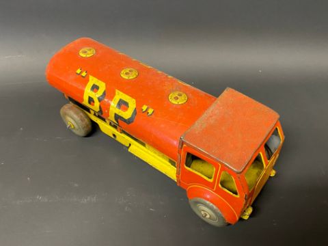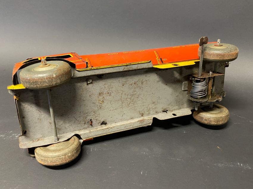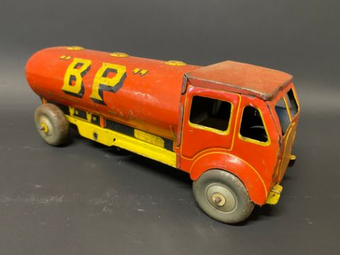 A clockwork tinplate model of a petrol tanker in Shell BP livery.