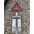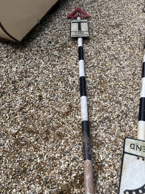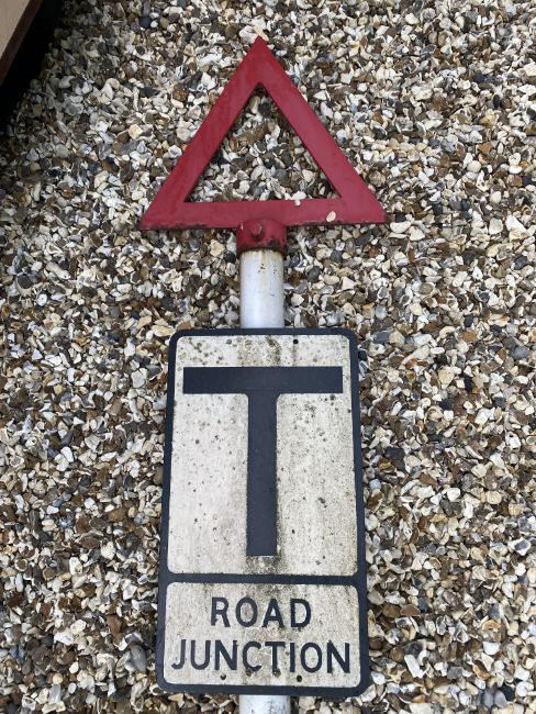 A metal road sign for Road Junction mounted on a tall post, surmounted by a warning triangle.