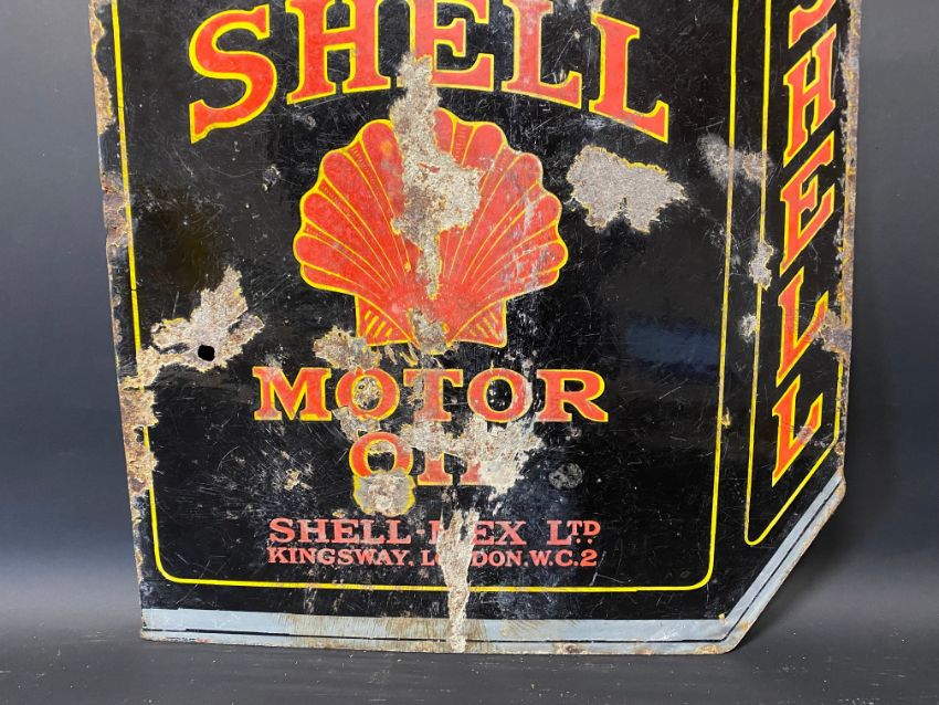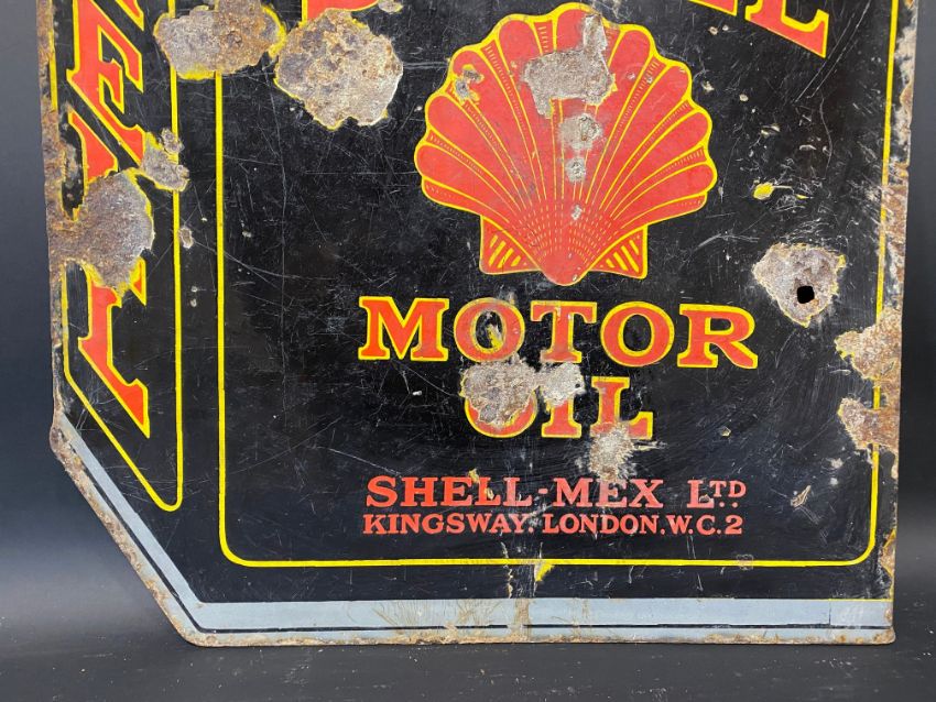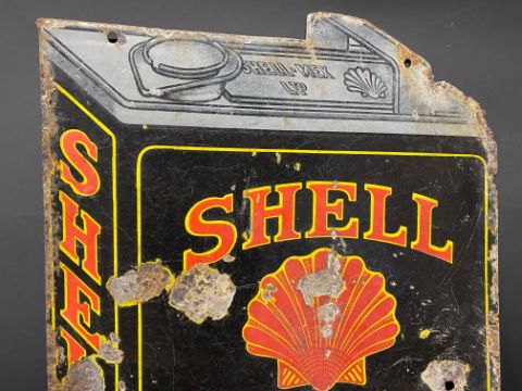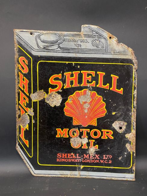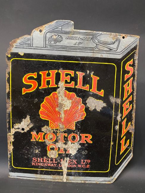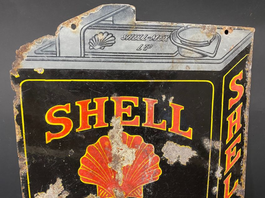 A Shell Motor Oil can-shaped double sided enamel sign, earlier dark grey version, 16 x 20".