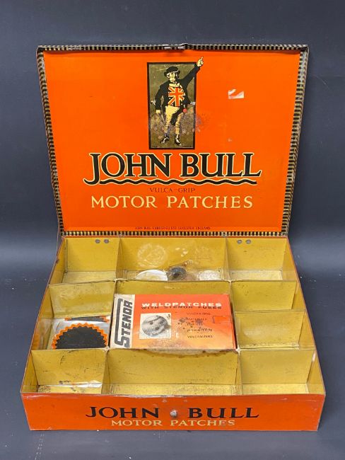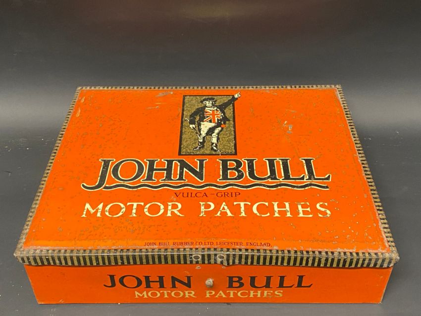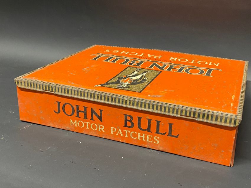 A large John Bull Motor Patches counter top dispensing tin, 13" wide.