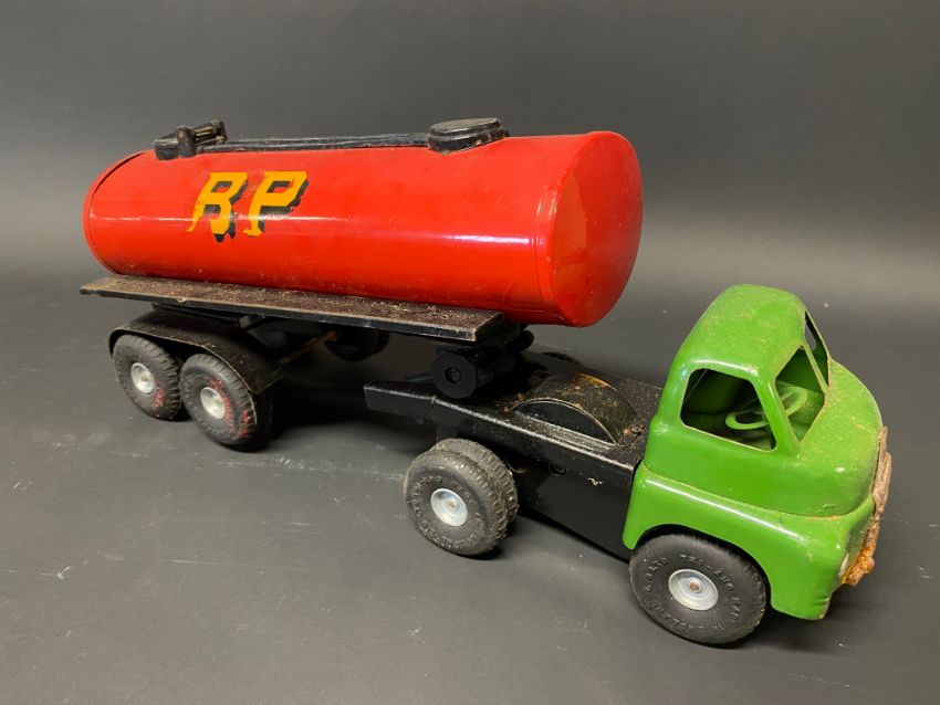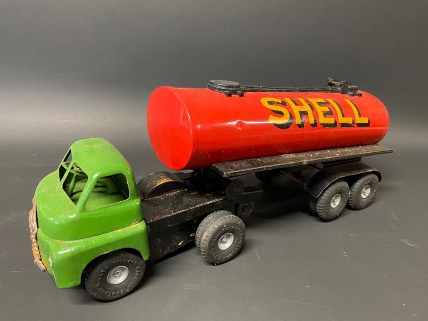 A Tri-ang Minic Toys model of an articulated petrol tanker in Shell BP livery.