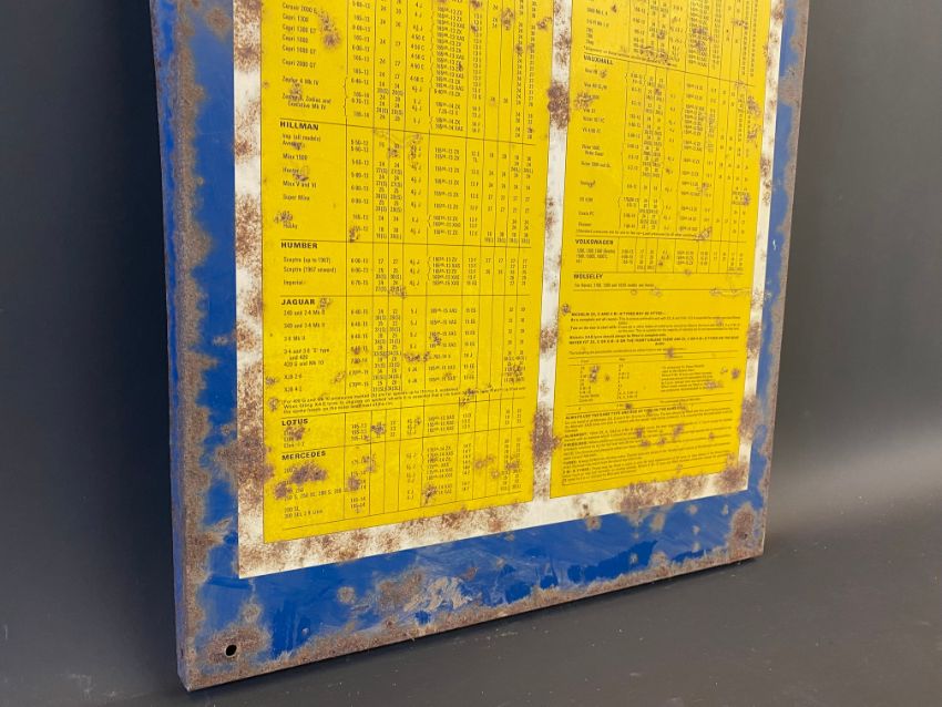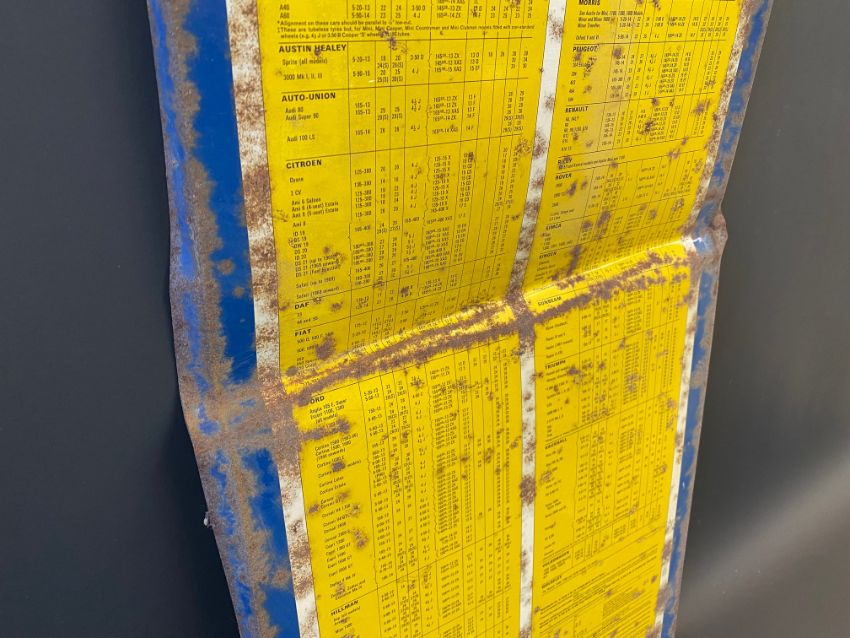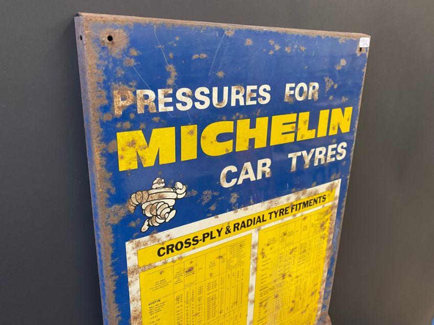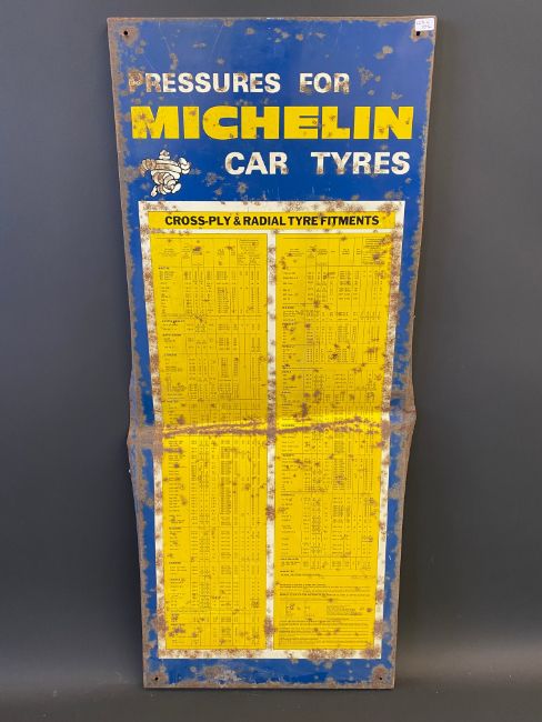 A Michelin Car Tyres tin tyre pressure chart sign, 12 1/4 x 29 1/2".