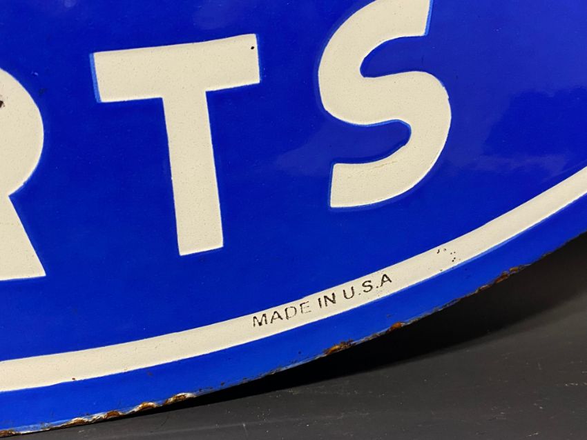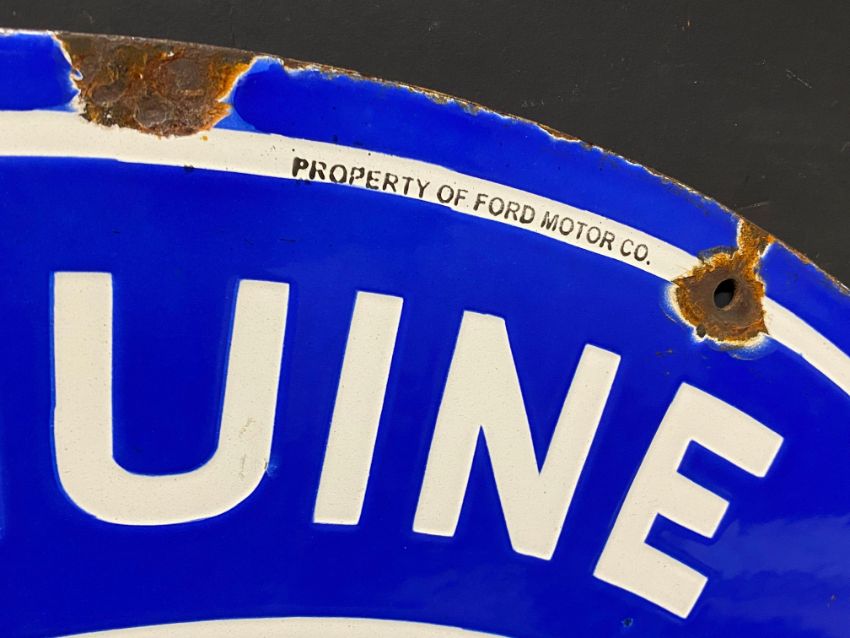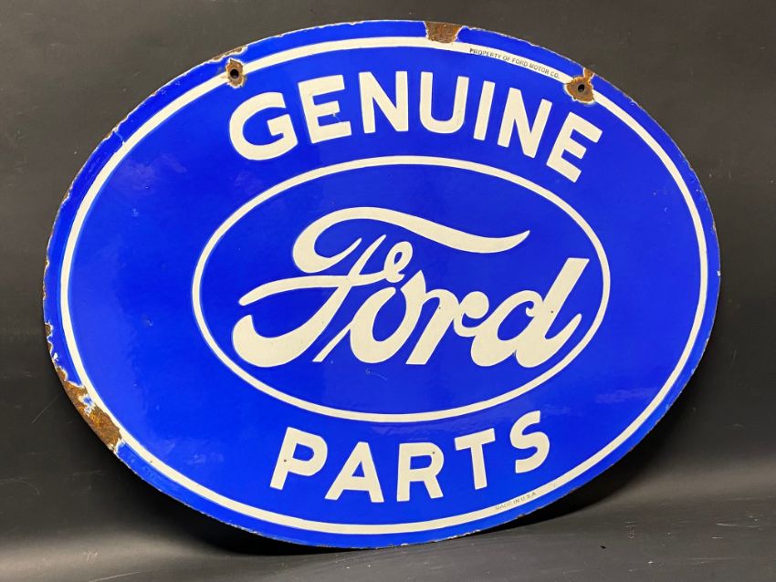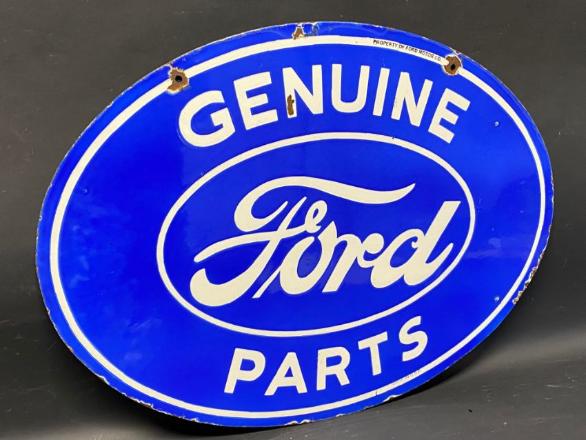 A Ford Genuine Parts oval double sided enamel sign stamped: Property of Ford Motor Co., made in USA, excellent gloss, 24 1/4 x 18 1/4".