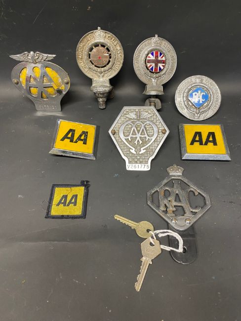 A tray of mixed RAC and AA badges including commercial.