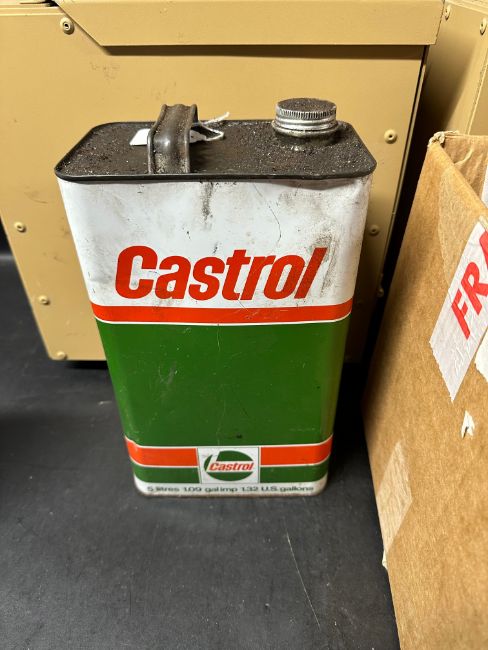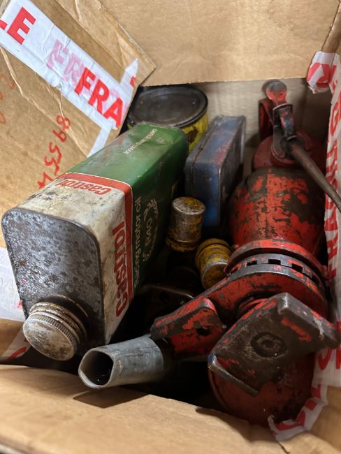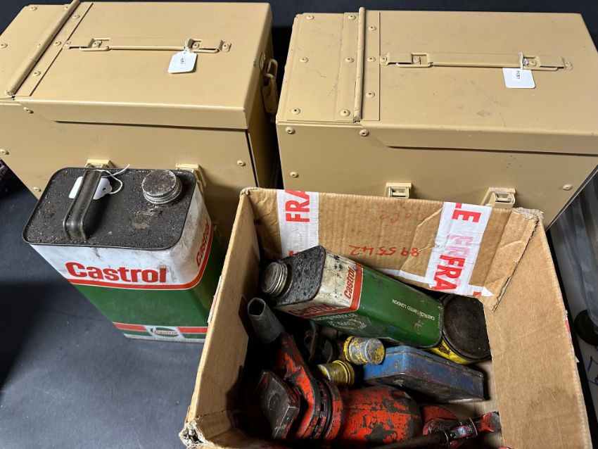 Two military-style metal containers and petrol-related tins