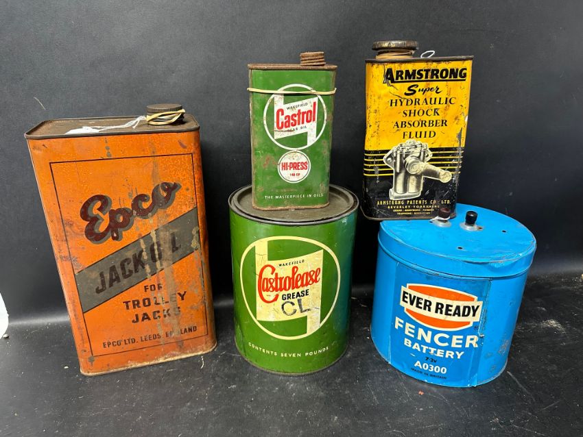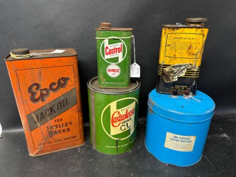 A Wakefield Castrolease 7lb grease tin, an Epco Jack Oil one gallon can and three others.