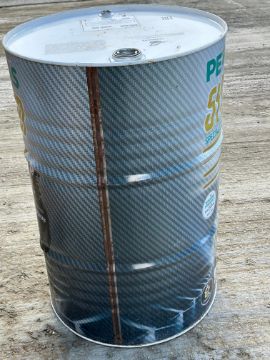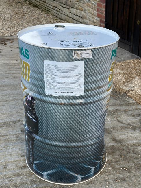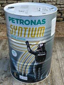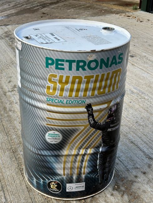 A Petronas Syntium Special Edition for World Champs 200L drum depicting Lewis Hamilton, 34 1/4" high (empty).