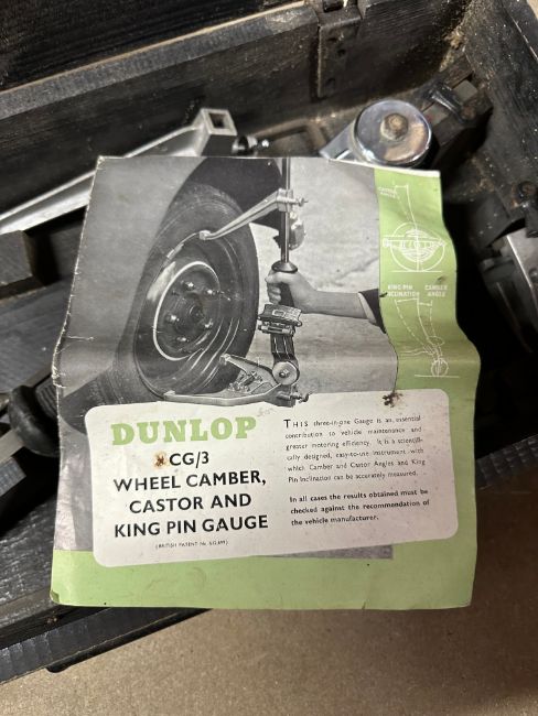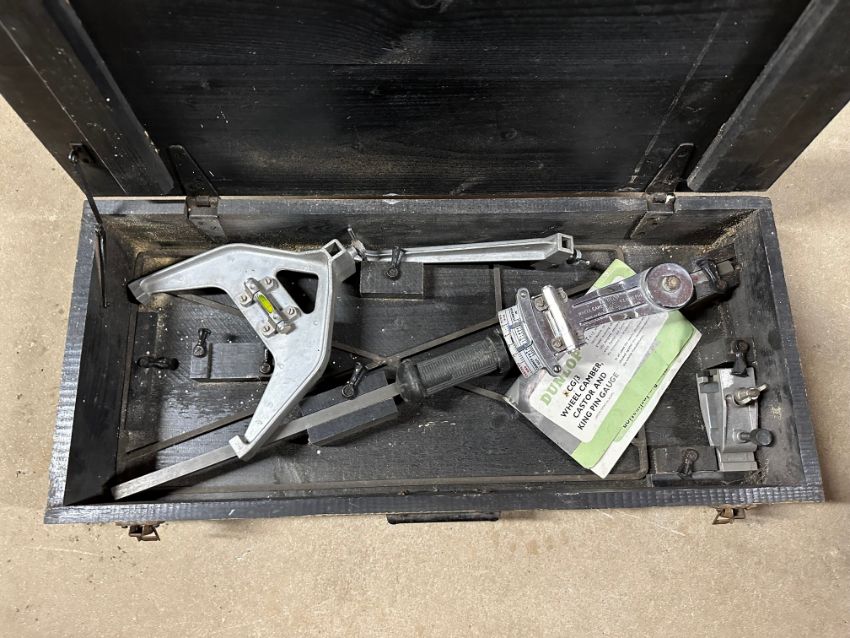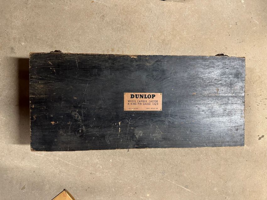 A boxed Dunlop wheel camber castor and king pin gauge CG/3 in wooden box with brass plaque to lid.