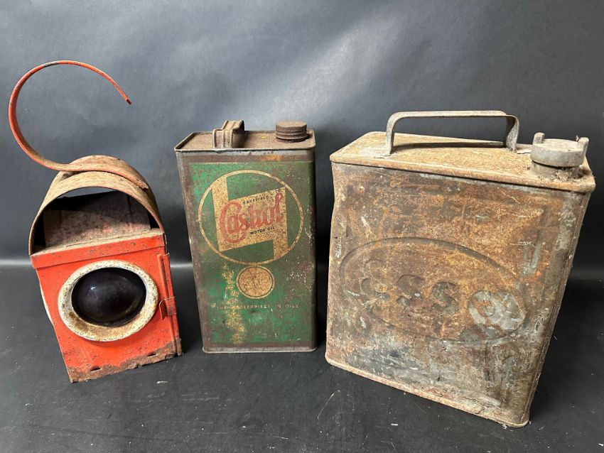 An Esso two gallon can with plain cap, a road lamp and a Wakefield Castrol Motor Oil gallon can.