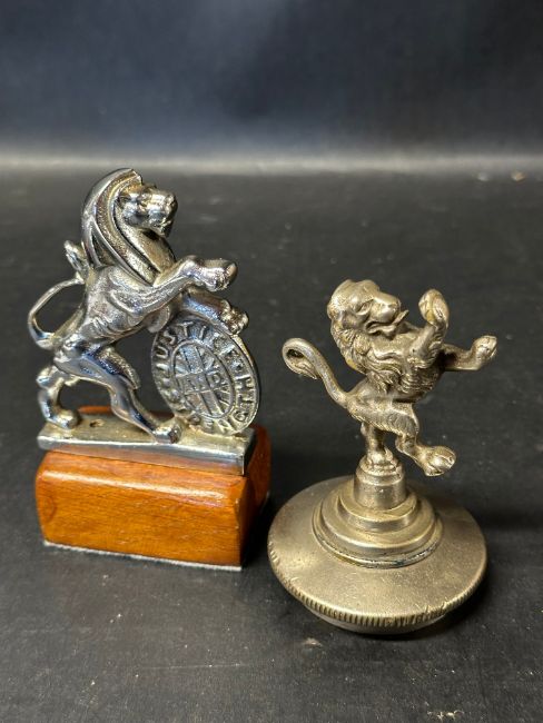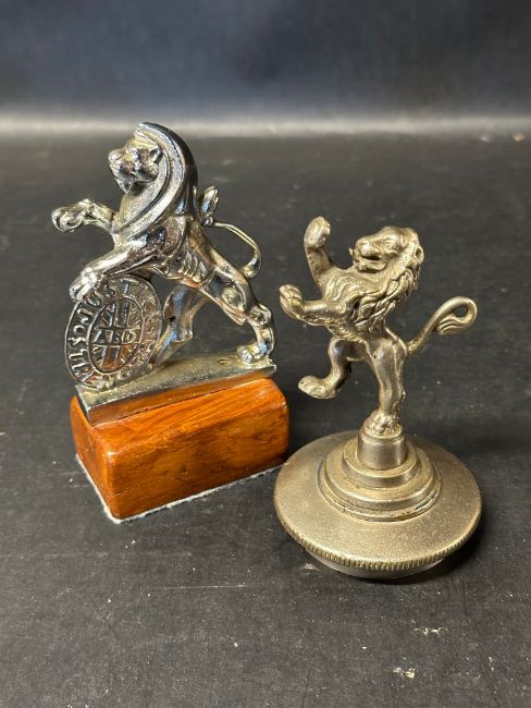 Two car accessory mascots depicting rampant lions, one possibly Gilbert & Son (with shield of justice), wooden display base mounted, the other by Argyle, radiator cap mounted.
