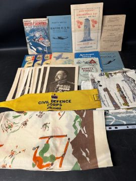 A good lot of late 1930s/early 1940s aviation, aircraft, miliatria inc. pilot's notes, instruction book, Safety First, a Civil Defence Cops Welfare arm band, tea towels and a good skiing-related scarf.