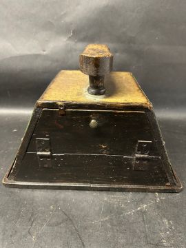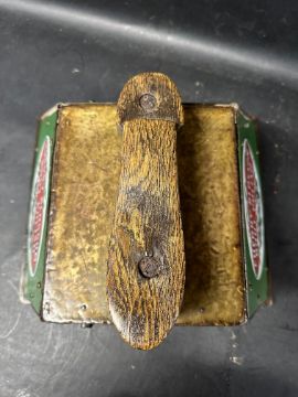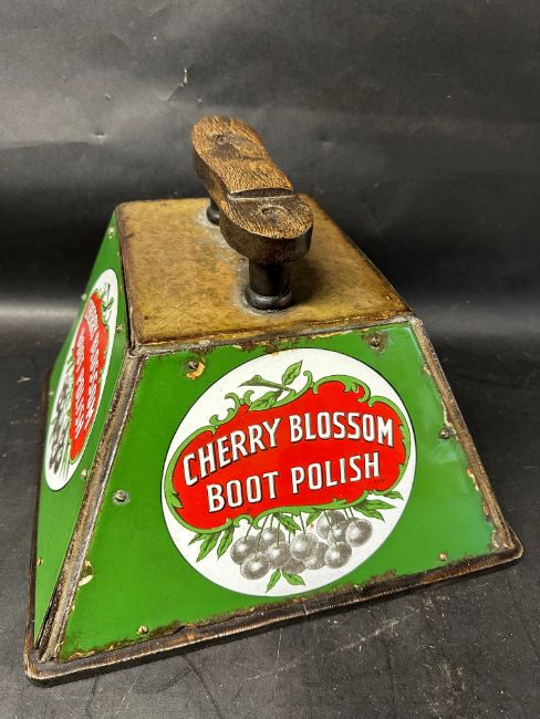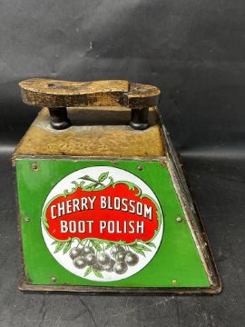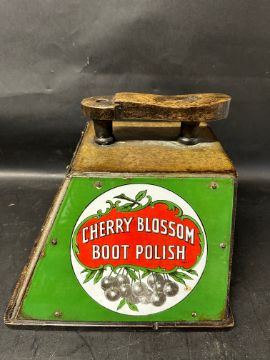A Cherry Blossom Boot Polish shoe shiner's box with three enamel panels.