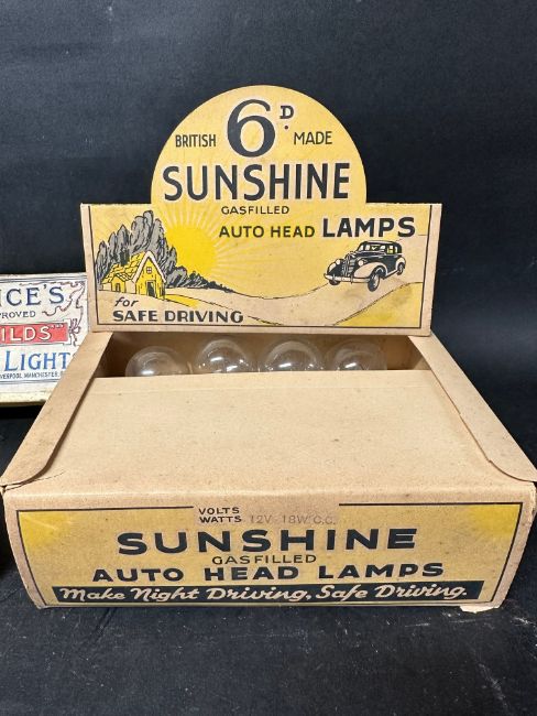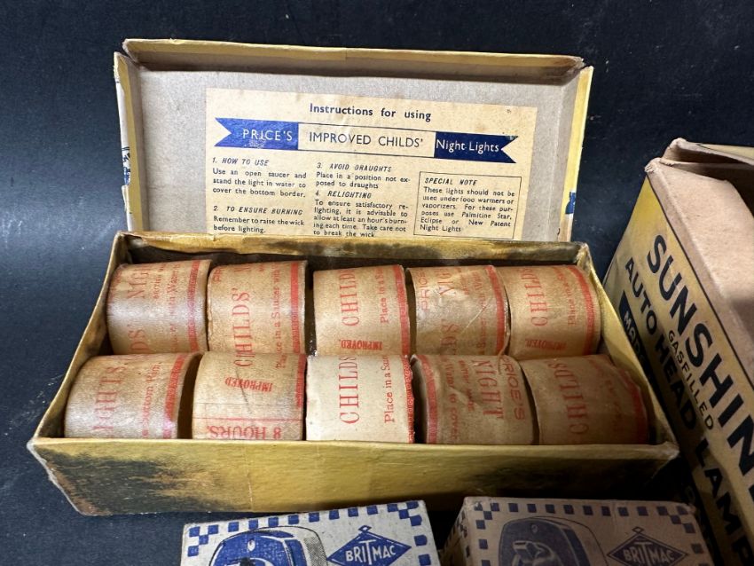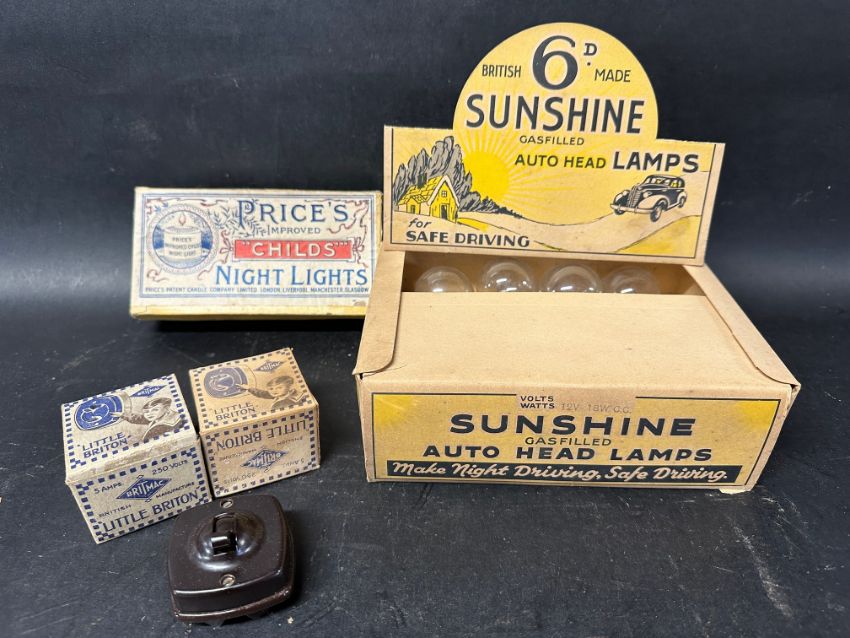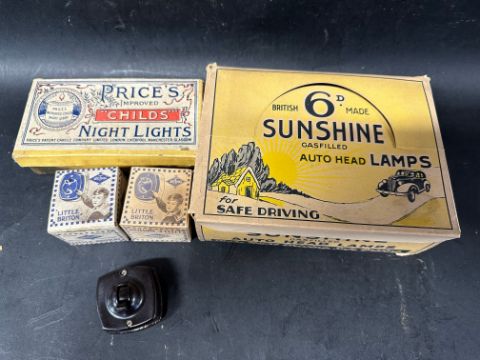 A complete set of 12 Sunshine Gasfilled Auto Head Lamps in original shop display box, a complete boxed set of Price's 'Childs' Night Lights and two Little Briton light switch boxes, one with contents.
