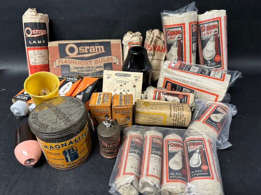 A good selection of wartime lamps, light bulbs, night lights, a Magnalite magnetic inspection lamp, bakelite lamps etc. including Osram, Vesta, Para-Phinx, Lumax, Ediswan etc.