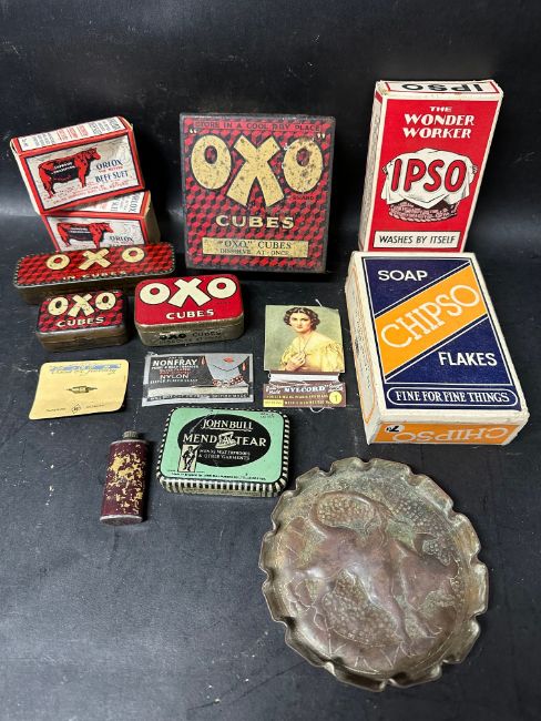 A selection of advertising including Oxo tins, a John Bull repair outfit, Orlox Beef Suet boxes, Ipso and Chipso soap flakes and a change tray with an image of bull imprinted.
