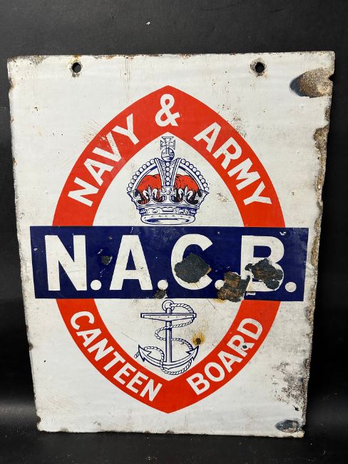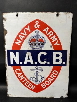 An N.A.C.B. Navy & Army Canteen Board double sided enamel hanging advertising sign, 18 x 24".
