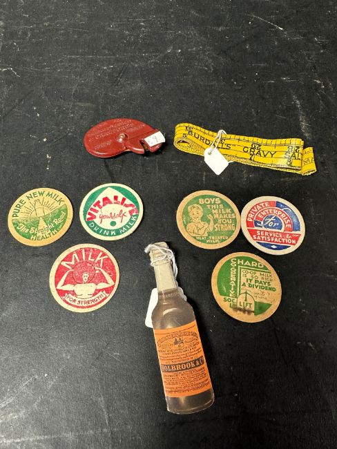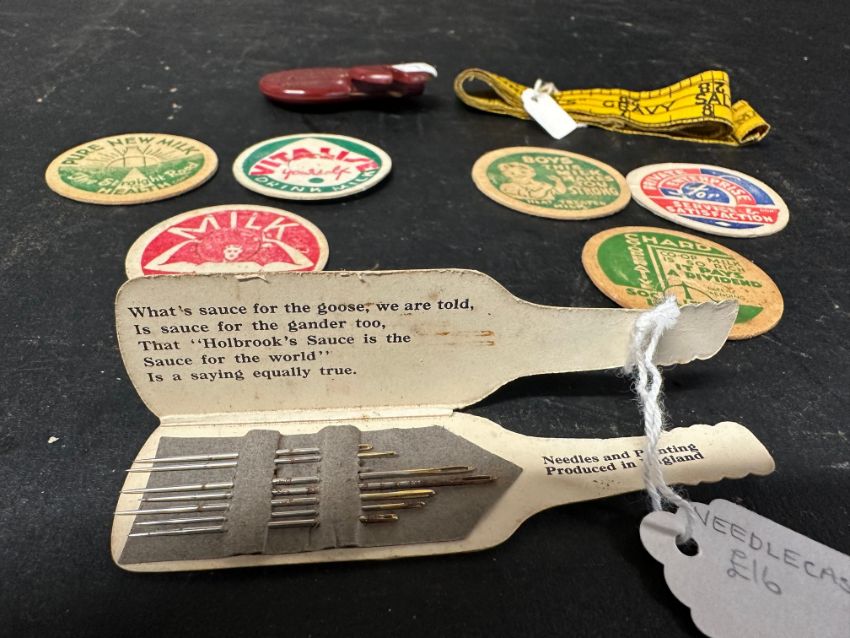 A superb selection of early advertising including a Crawfords Biscuits 'Keepcrisp' opener, a tape measure advertising Burdall's Gravy Salt, a needlecase advertising Holbrook & Co. Worcestershire Sauce and six milk bottle tops.