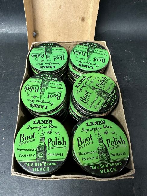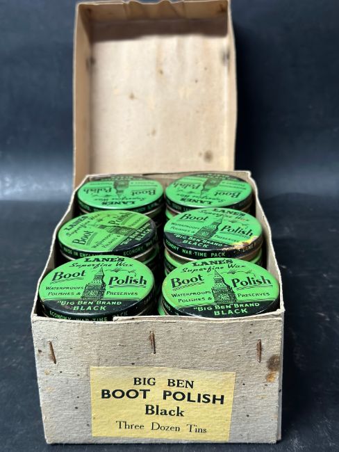 A complete set of 36 Lane's Boot Polish tins in original shop display box, ''Big Ben'' Brand Black.