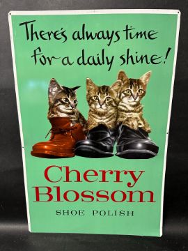 A Cherry Blossom Shoe Polish tinplate advertising sign depicting kittens in boots, 17 3/4 x 26 1/4".