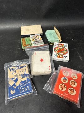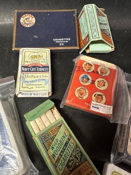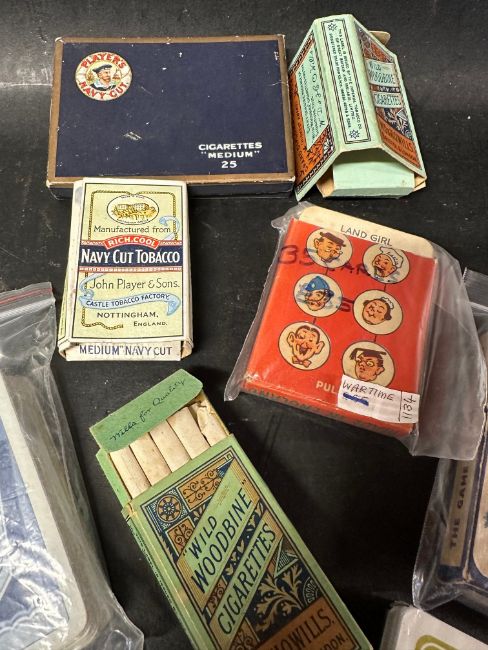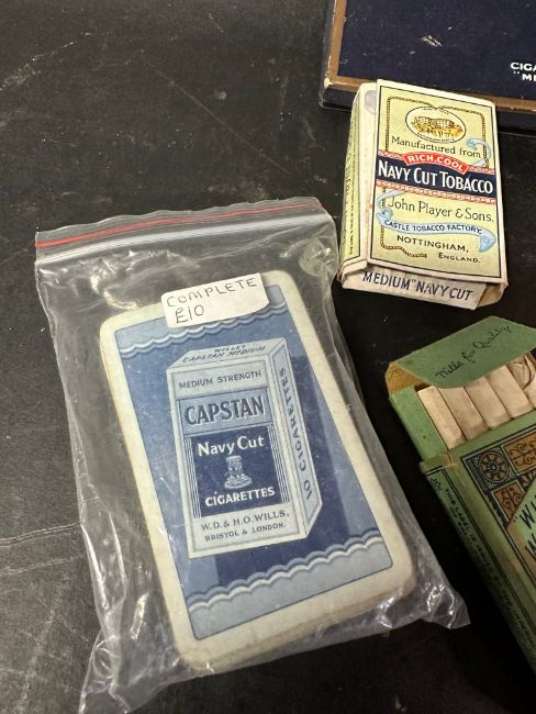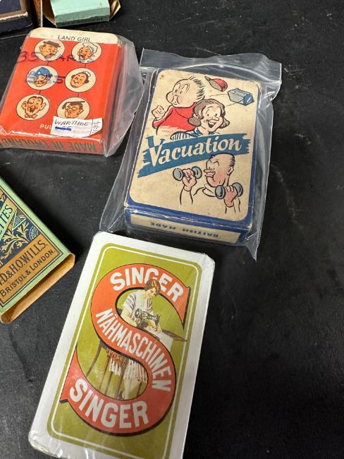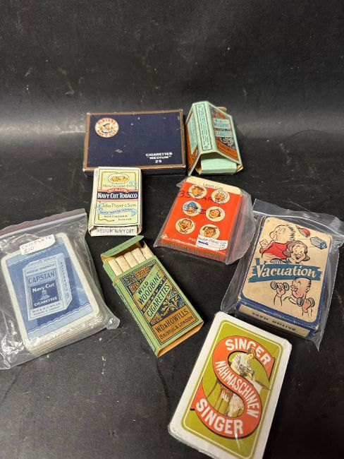 Four early cigarette packets, one complete with contents, two wartime sets of playing cards (unchecked), a complete set of playing cards advertising Capstan Navy Cut and an unused set advertising Singer Sewing Machines.