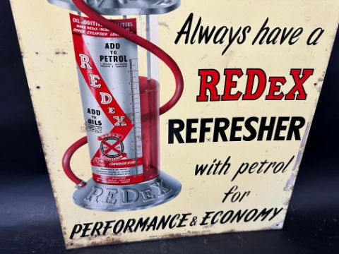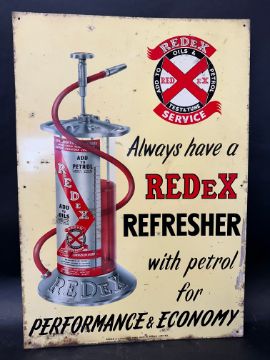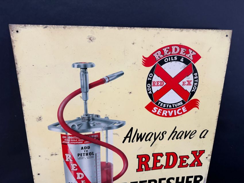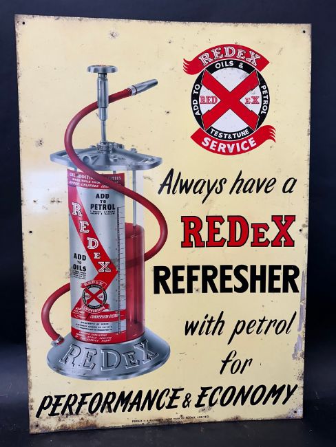 A Redex Service pictorial tin advertising sign 'Always have a Redex Refresher with petrol for Performance & Economy', 17 1/2 x 25".