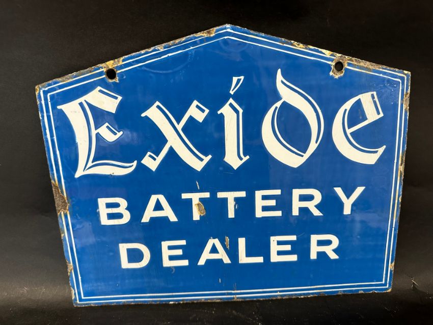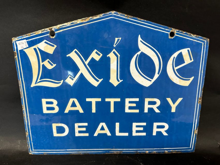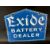 An Exide Battery Dealer double sided hanging enamel advertising sign, 15 x 12".
