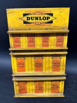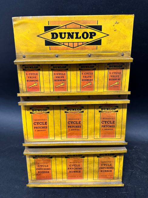 A Dunlop countertop point of sale tin stand for cycle valve rubbers, Reddifix Cycle Patches and Patching Rubber, 7 1/2 x 12 1/4".