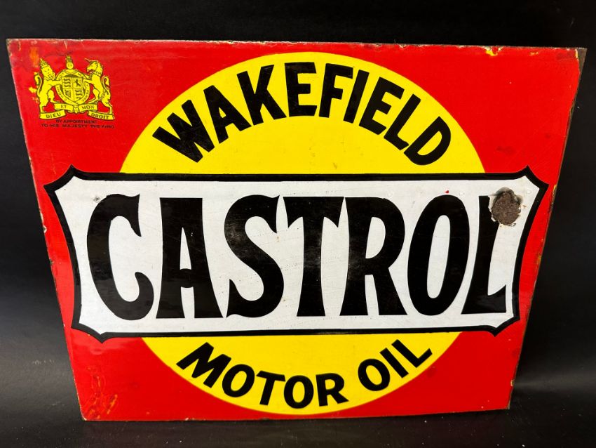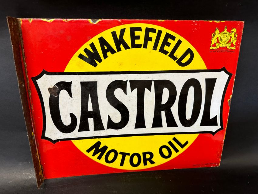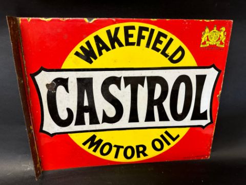 A Wakefield Castrol Motor Oil double sided enamel advertising sign with hanging flange by Bruton of Palmers Green, 20 x 16".
