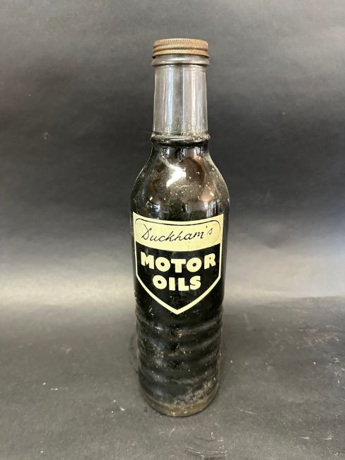 A Duckhams quart glass oil bottle with lid.