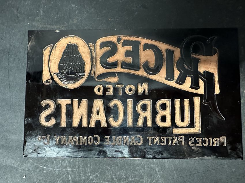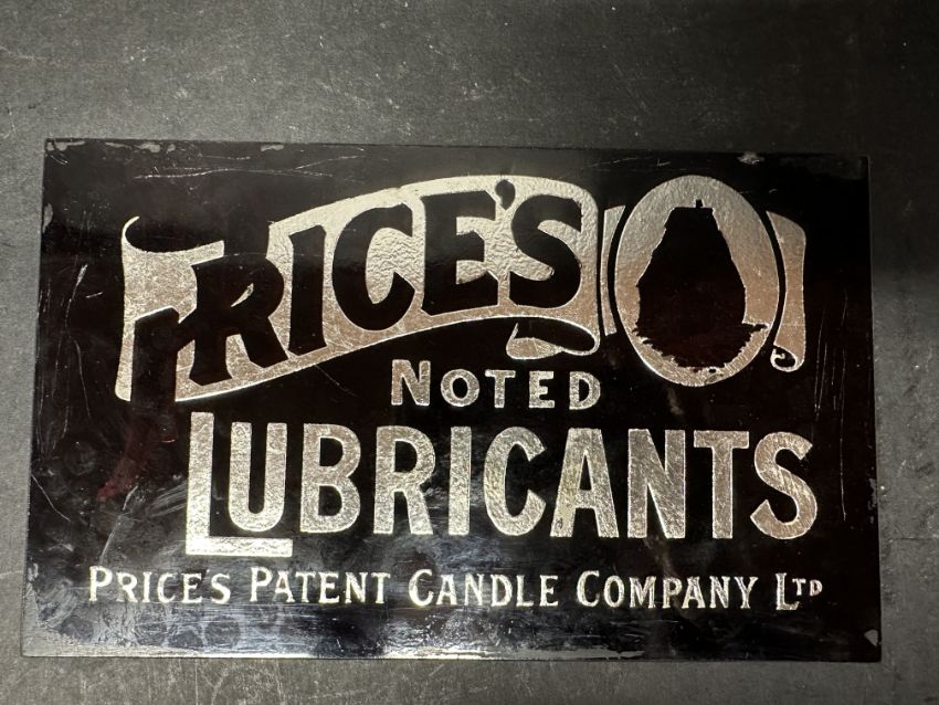 A Price's Noted Lubricants red window glass advertising sign/panel, 9 x 5 1/2".