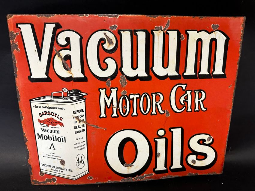 A Vacuum Motor Car Oils pictorial double sided enamel advertising sign with hanging flange with image of a Gargoyle Mobiloil A grade can, 20 1/4 x 16".
