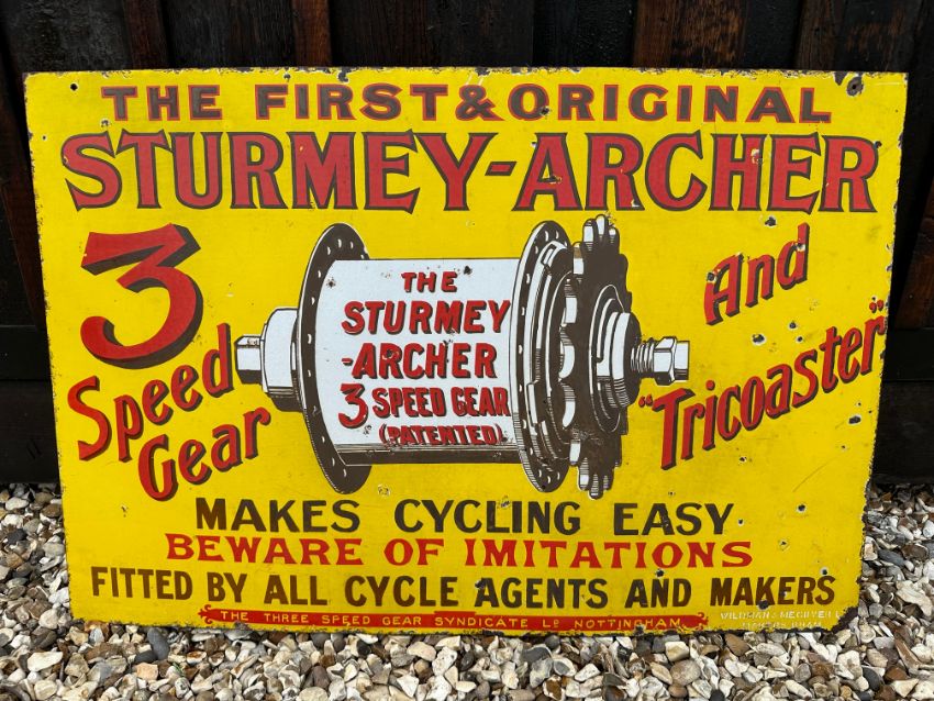A Sturmey-Archer 3-Speed Gear Syndicate Ltd. Nottingham enamel pictorial advertising sign by Wildman and Meguyer, an early sign in good condition, 36 x 24 1/4".