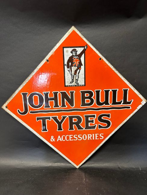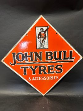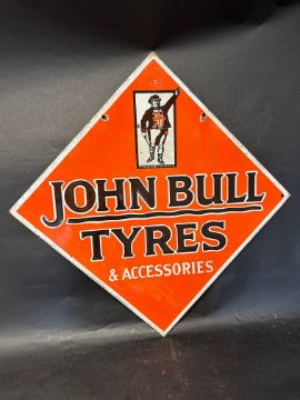 A John Bull Tyres double sided lozenge shaped enamel advertising sign, 28 x 28".