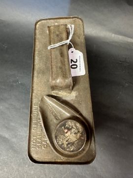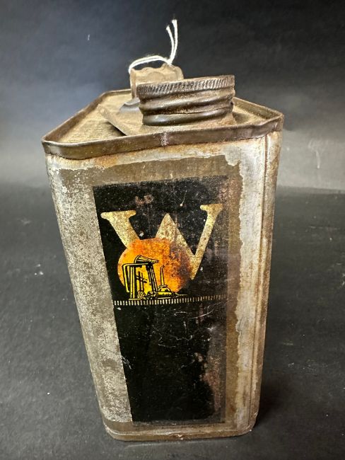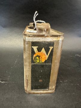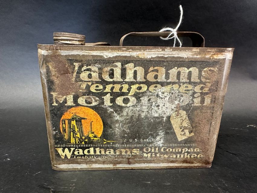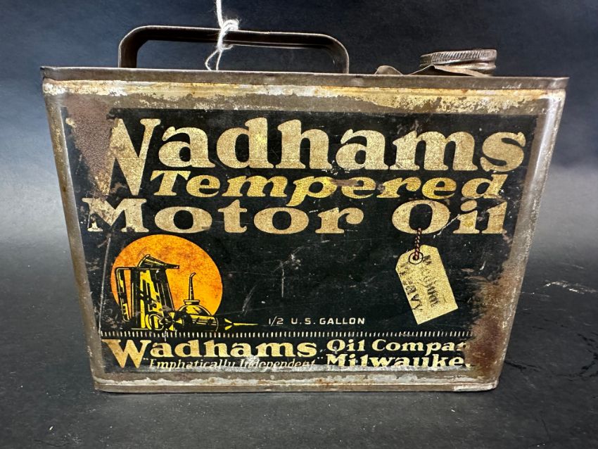 An early Wadhams Tempered Motor Oil rectangular oil can containing 1/2 US gallon.