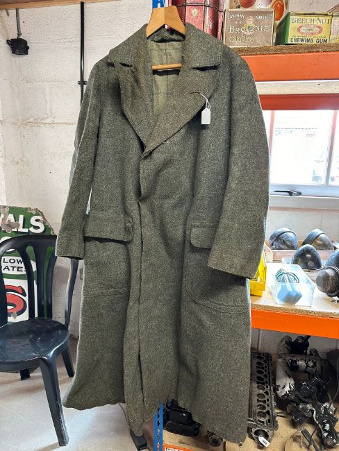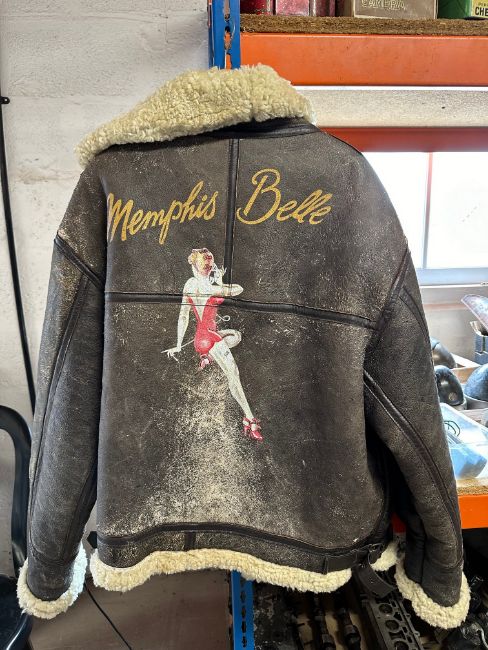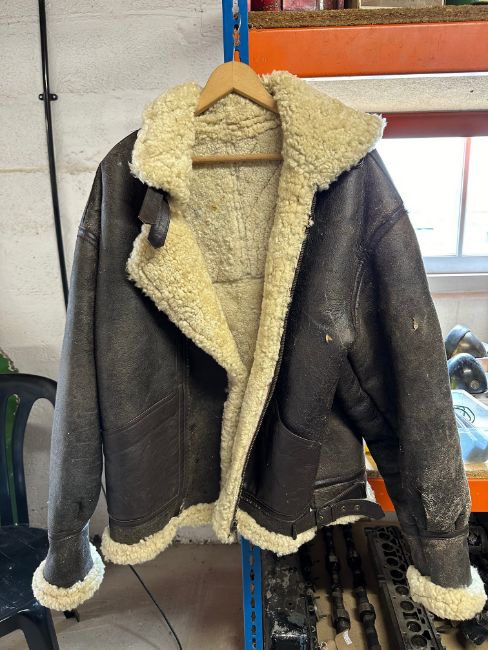 Three gentleman's coats: a heavy sheepskin flying jacket with Memphis Belle graphics to the back, a long leather driving coat and a woollen coat.