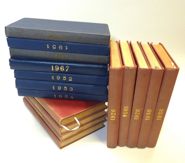 Motor Exhibition Catalogues. Almost a run of volumes from 1926 to 1966, bound in red and blue bindings, with gilt year titles to the spines (29).