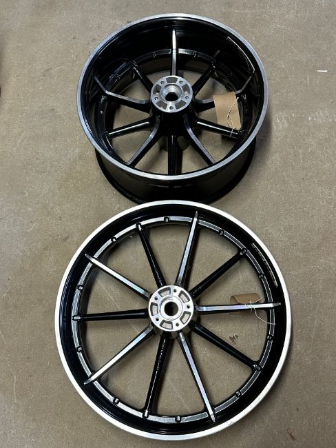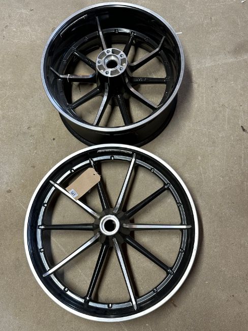A pair of Harley Davidson wheels, appear either brand new or recently restored.