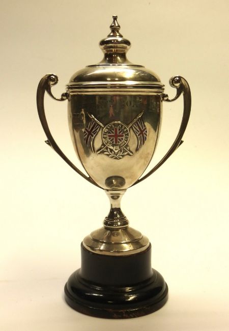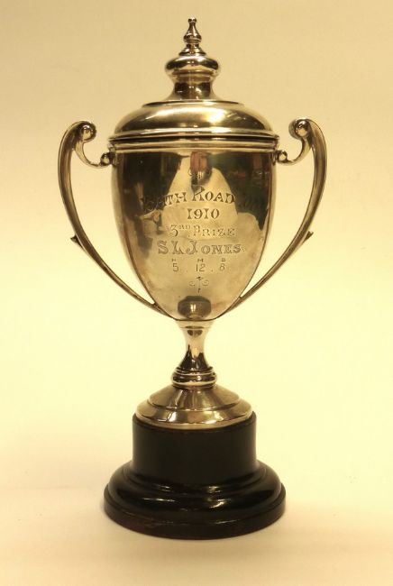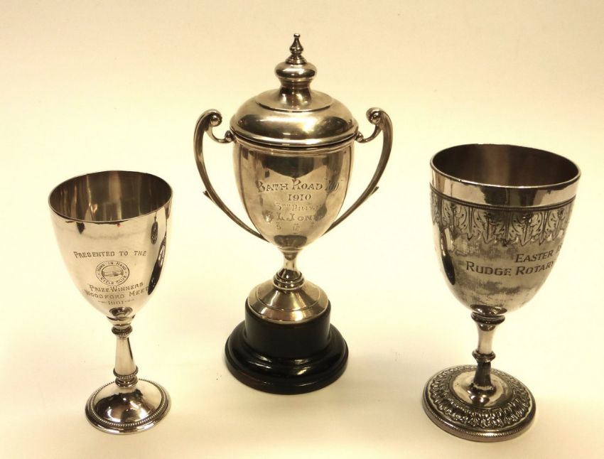 The Bath Road Club. An assayed silver two-handled cup and lid inscribed, 'Bath Road 100 - 1910 - 3rd Prize S.L Jones - 5hr 12m 8s', 9" tall inc plinth, the B.R.C. armorial and union flags recto. Assayed in London 1910. Also, the 'Blakesley Cup' inscribed 'Easter 1882 Rudge Rotary Tricycle', plated on brass and the 'Hand in Hand Cycle Club' - Prize Winners Woodford Meet - 1901, plated on brass.