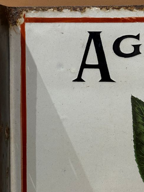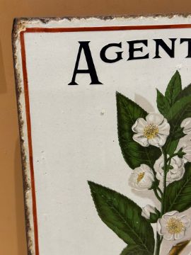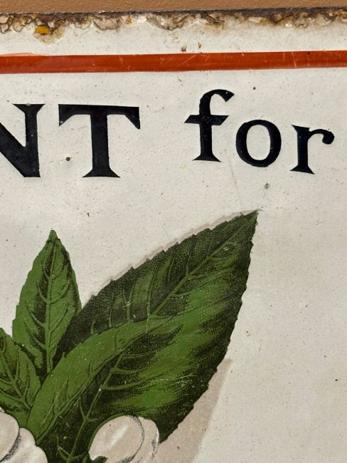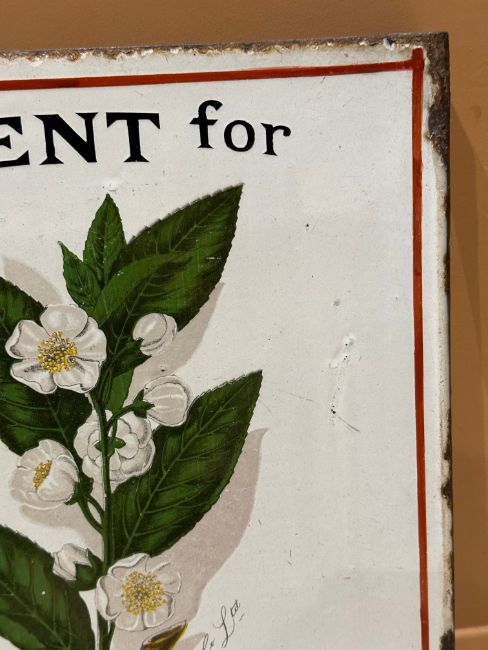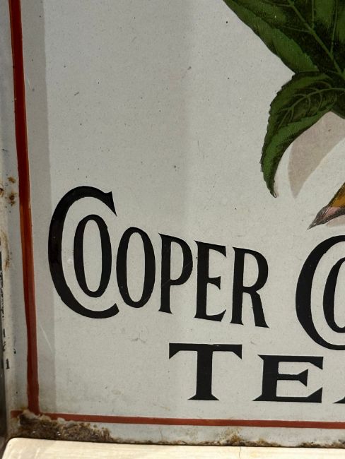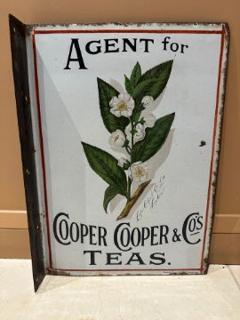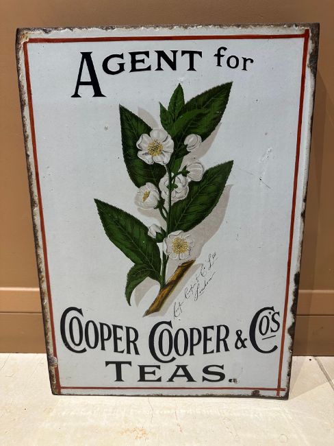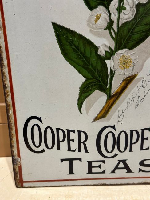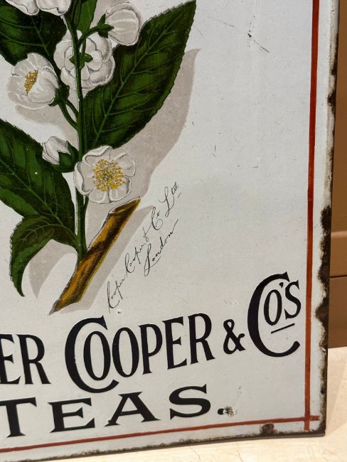 A rare and exceptional Cooper Cooper & Co's Teas of London double sided pictorial enamel advertising with hanging flange by Patent Enamel depicting a botanical image, a blossoming branch, 13 1/2 x 19".