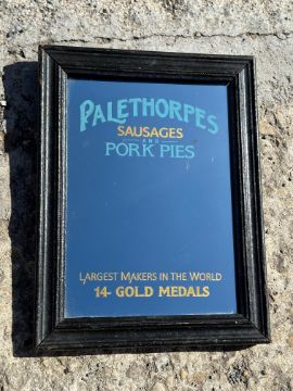 A Palethorpes Sausages and Pork Pies advertising mirror with early '14 Gold Medals', 9 3/4 x 13".