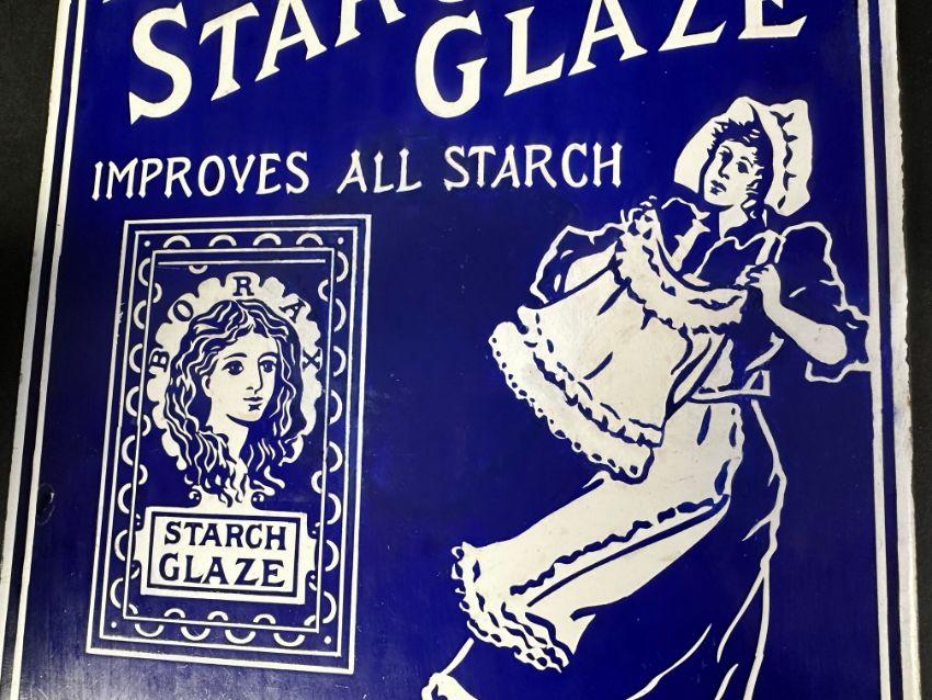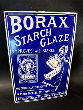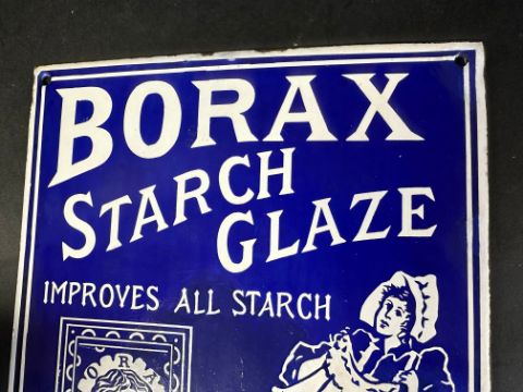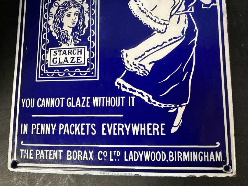 A Borax Starch Glaze pictorial enamel advertising sign with laundress and packet images, by Chromo of Wolverhampton, professionally restored, 10 x 15".