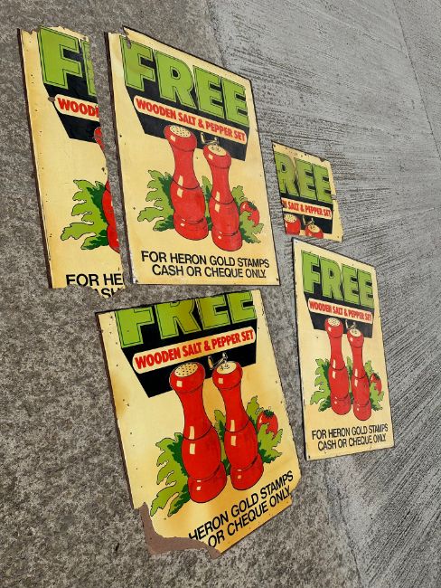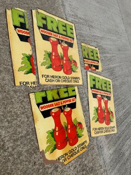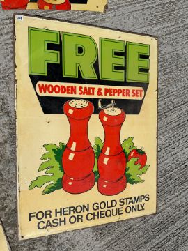 Advertising boards for Heron Gold Stamps FREE wooden salt and pepper sets, 35 3/4 x 48".