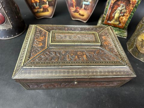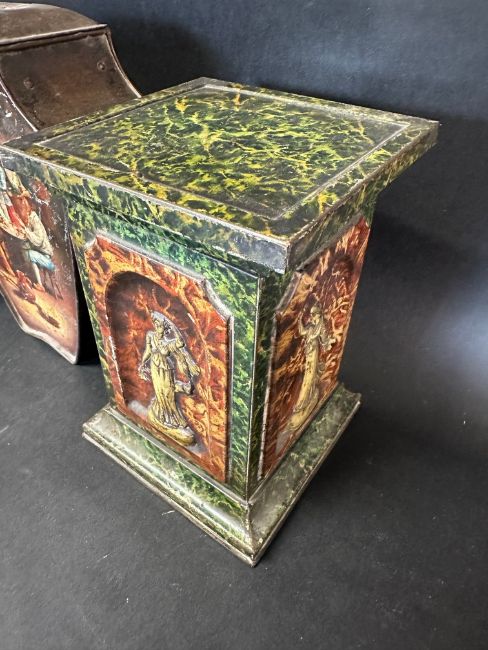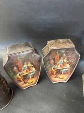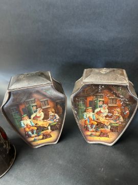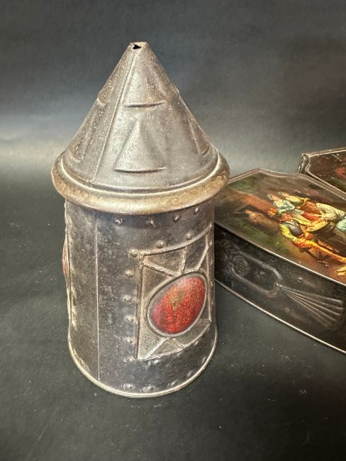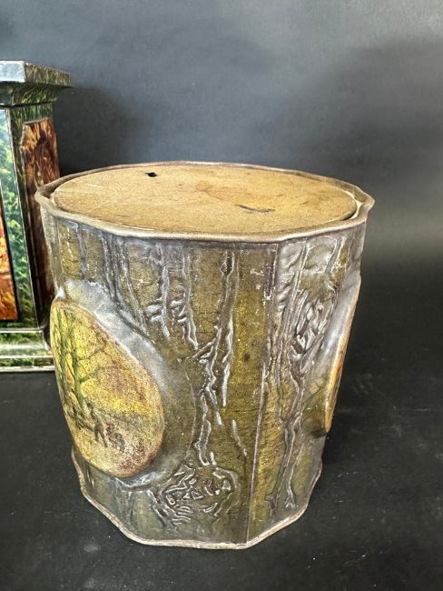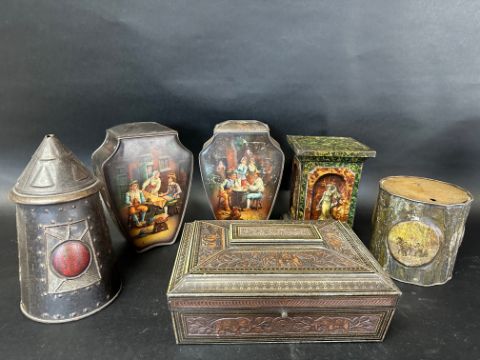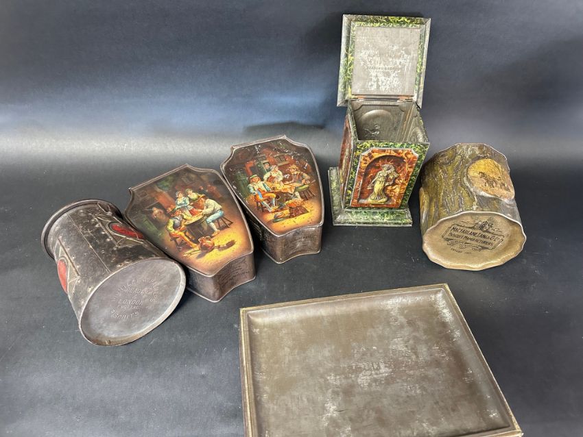 Six novelty biscuit tins including Art Nouveau designs: Huntley & Palmers (x5) and a Macfarlane, Lang & Co. Ltd. tree stump tin.