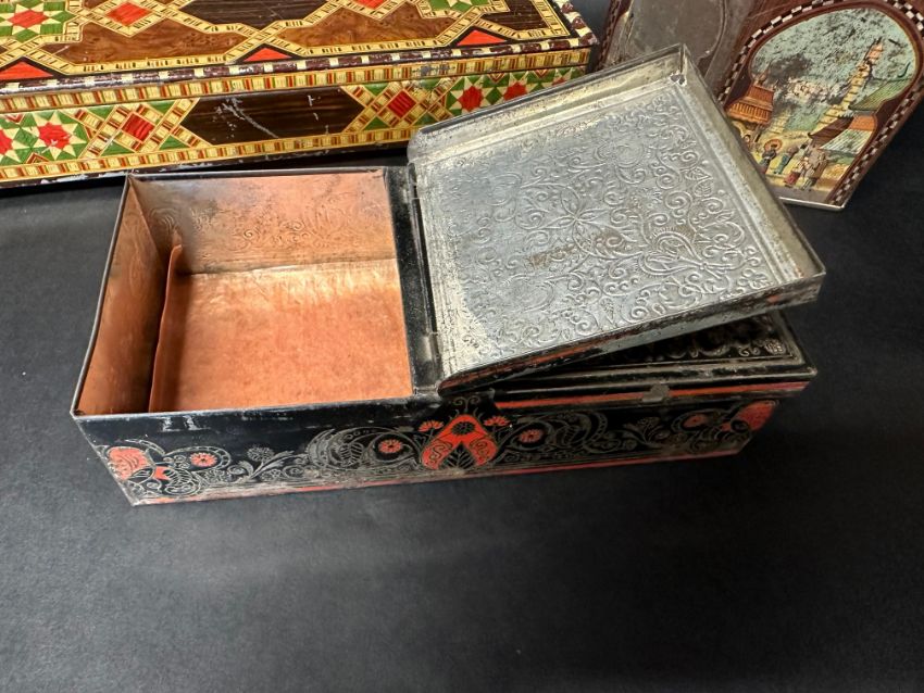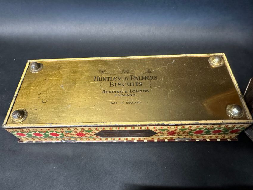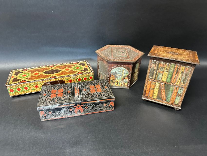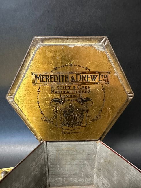 Four biscuit tins including a Huntley & Palmers bookshelf, a hexagonal Meredith & Drew Ltd. tin with royal warrant etc.