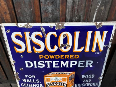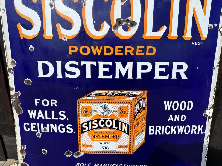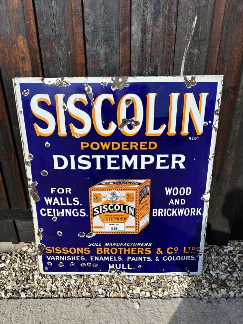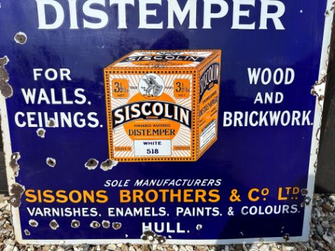 A Siscolin Powdered Distemper enamel advertsing sign for Sissons Brothers of Hull, rare pictorial sign mounted on board, 33 x 38".