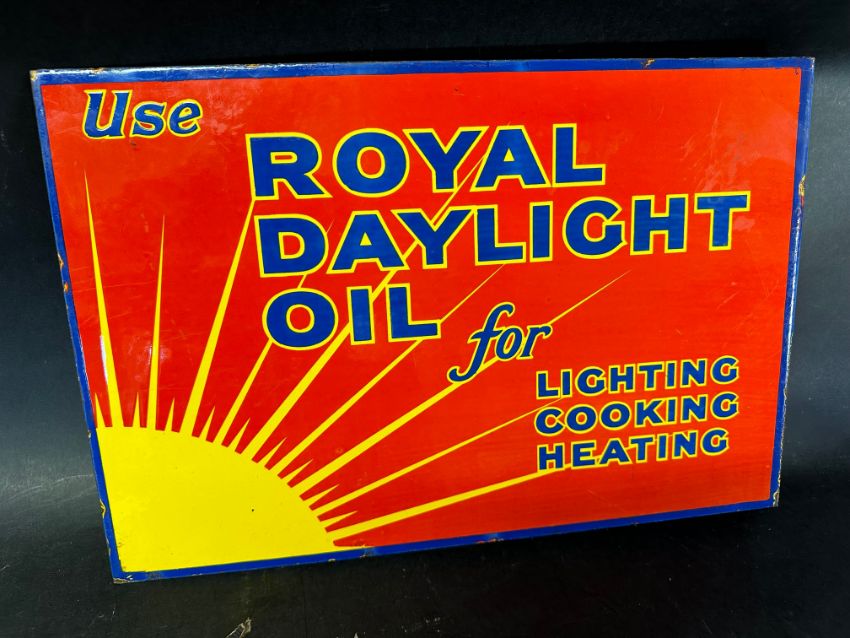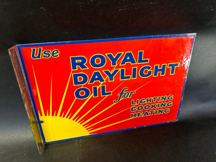 A rare Royal Daylight Oil double sided enamel advertising sign with hanging flange, excellent gloss, unusual bright colours, 18 x 12".