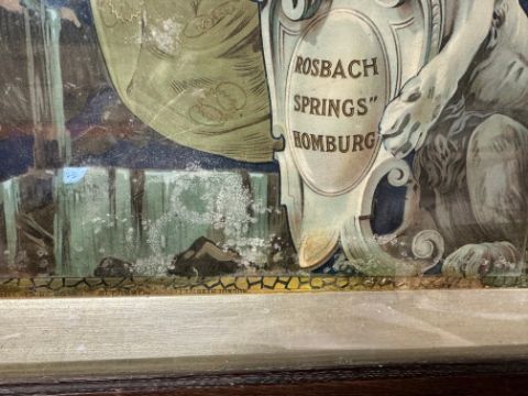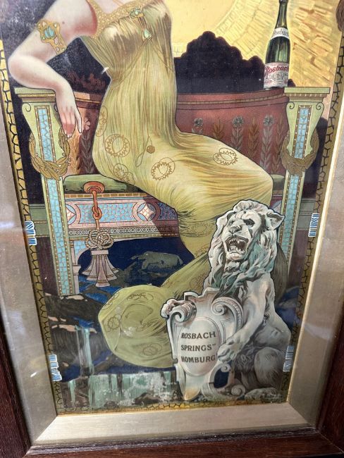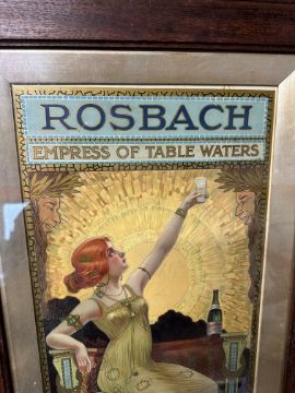 A 1903 Rosbach Springs Homburg advertising poster for table waters depicting an Art Nouveau scene of a lady holding a glass of the product, framed and glazed, 17 1/4 x 32" overall.